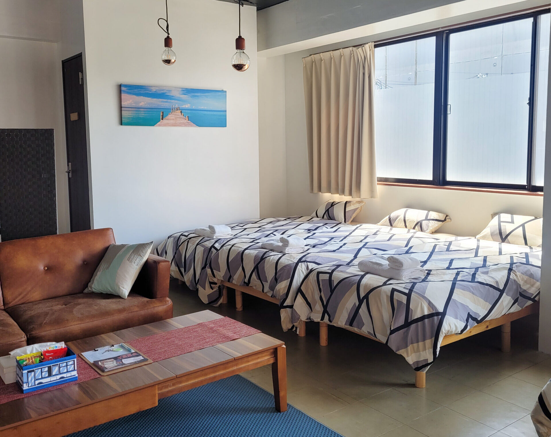 Features one double bed, one semi-double bed, and a cozy sofa bed